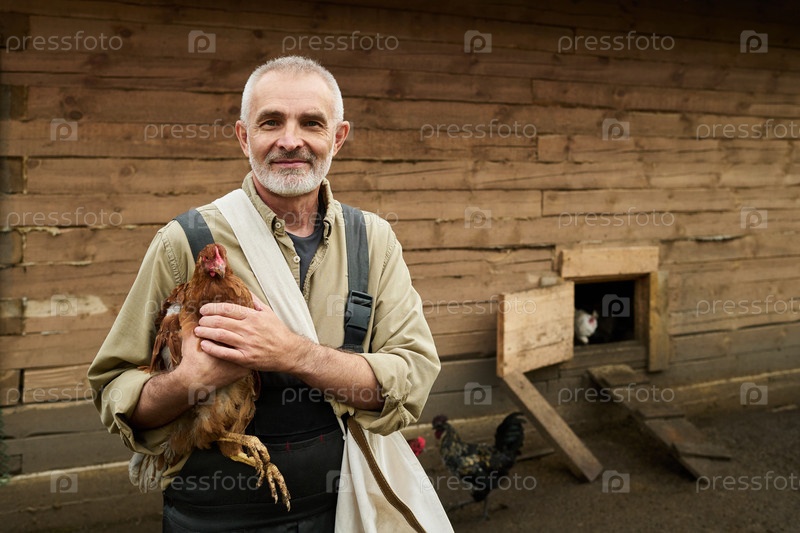Бородатый фермер держит коричневую выведенную курицу