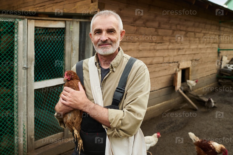 Старший фермер-мужчина с коричневой курицей