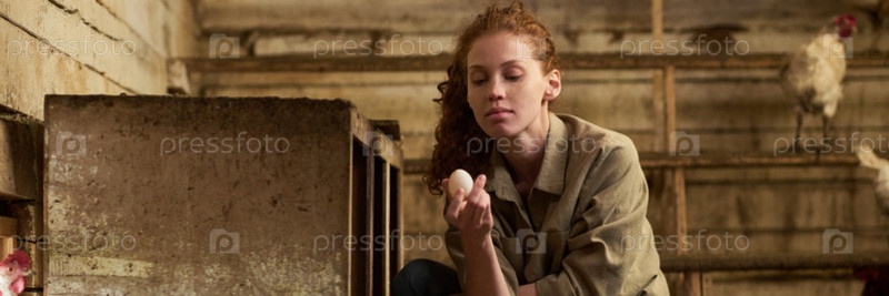 Молодой фермер держит свежее яйцо в руке
