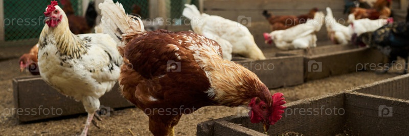 Курица пикает корм для птицы в яслях