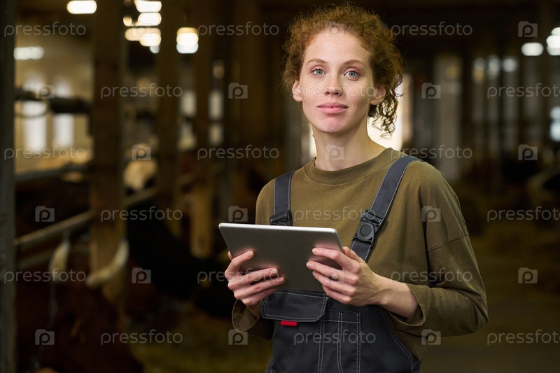Счастливая молодая фермерка, использующая планшет