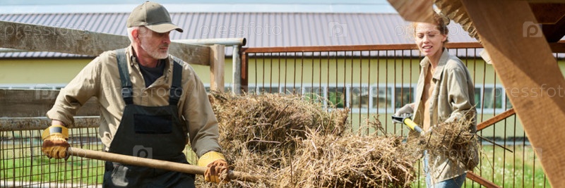 Сбор свежего сена в деревянную кормушку
