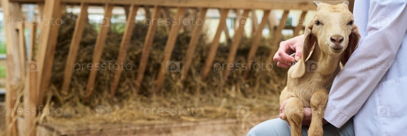 Милая коза на коленях у молодого ветеринара