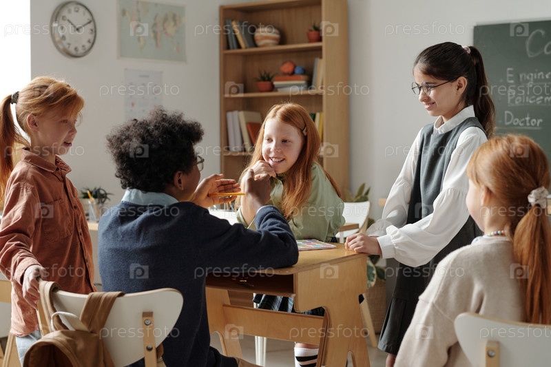 Девушки разговаривают со своими одноклассниками во время перерыва