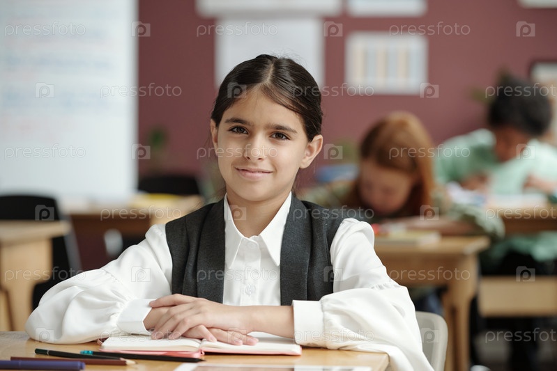 Усердная школьница-брюнетка на уроке