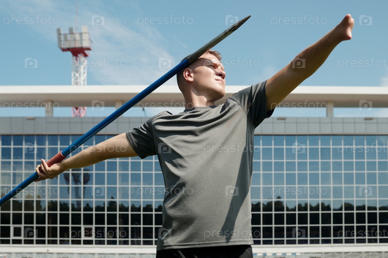 Держать копье на спортивном поле с решительным выражением лица
