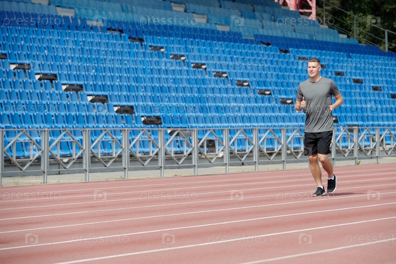 Человек бегает по трассе в стадионе