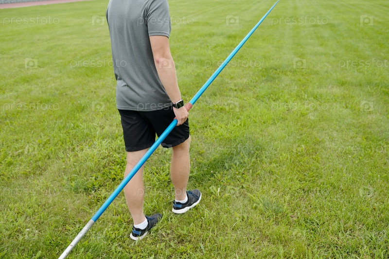 Ношение спортивной одежды, держа копье на травяном поле