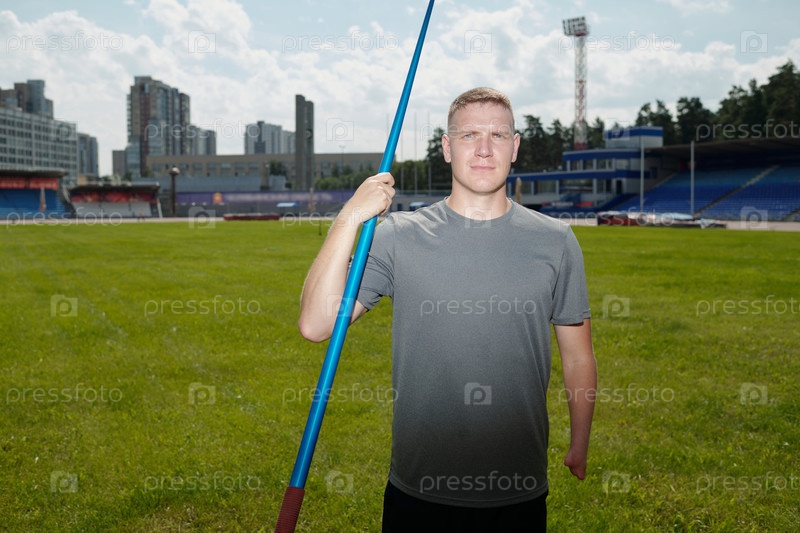 Держит копьё на спортивном поле под облачным небом