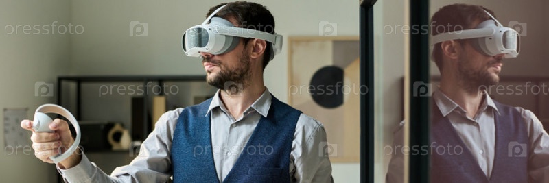 Молодой человек в очках использует контроллеры