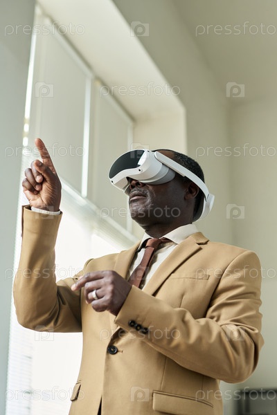 Зрелый брокер в костюме и гарнитуре VR