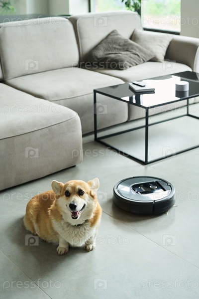 Корги смотрят на роботизированный вакуум Чистая современная гостиная