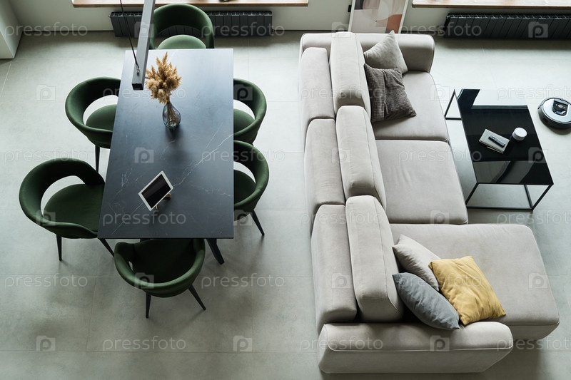 Уютная современная гостиная с установкой обеденного стола