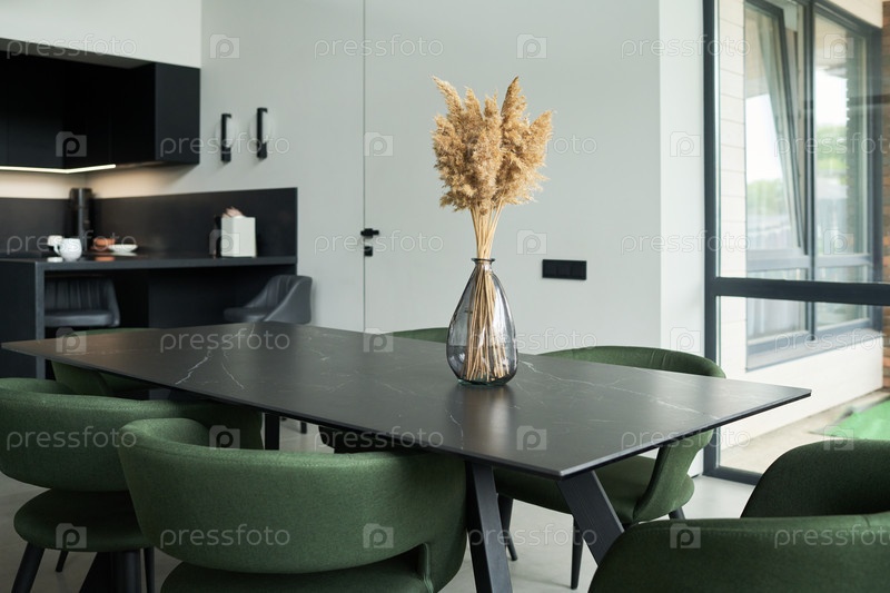 Столовая с зелеными стульями и современным минималистическим декором