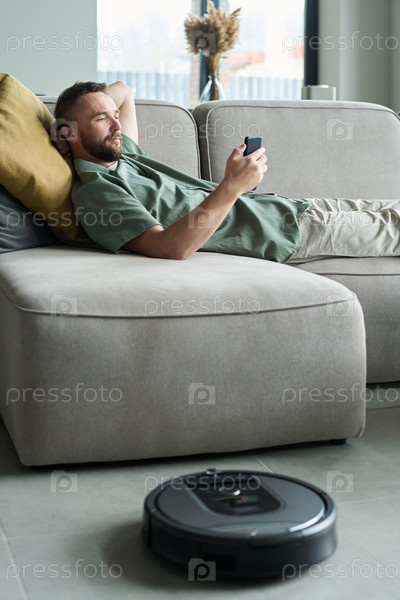 Расслабление на диване во время проверки телефона с помощью роботового вакуума