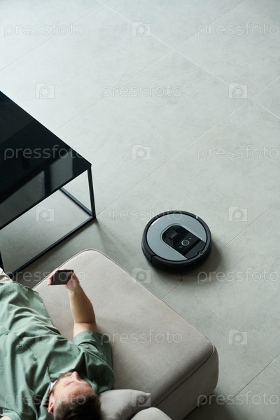 Расслабление на диване с роботизированным вакуумом в минималистической гостиной