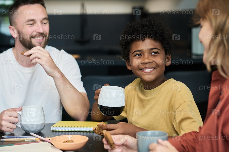 Улыбающийся ребенок наслаждается завтраком с членами семьи