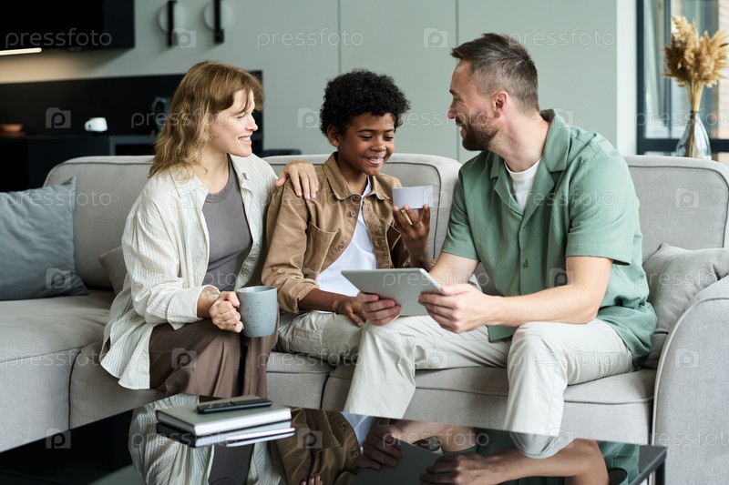 Разнообразная семья, участвующая в случайном разговоре в гостиной