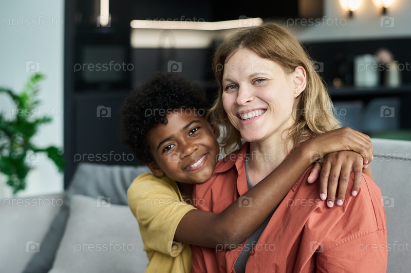 Улыбающуюся женщину обнимает ребенок с ярким выражением лица