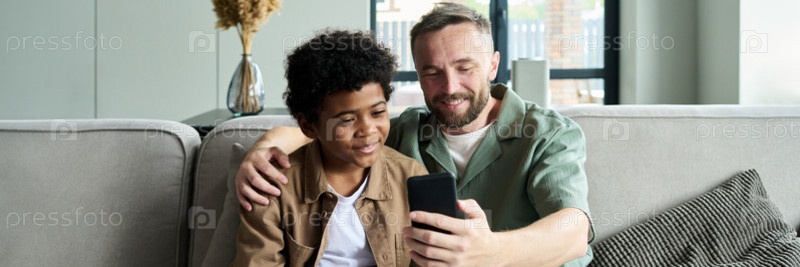 Улыбающийся мужчина и мальчик сидят на диване, используя телефон вместе