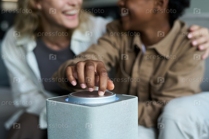 Взаимодействие с умным динамиком в уютной домашней обстановке