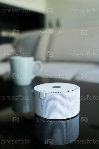Отображение белого круглого гаджета на отражающей поверхности