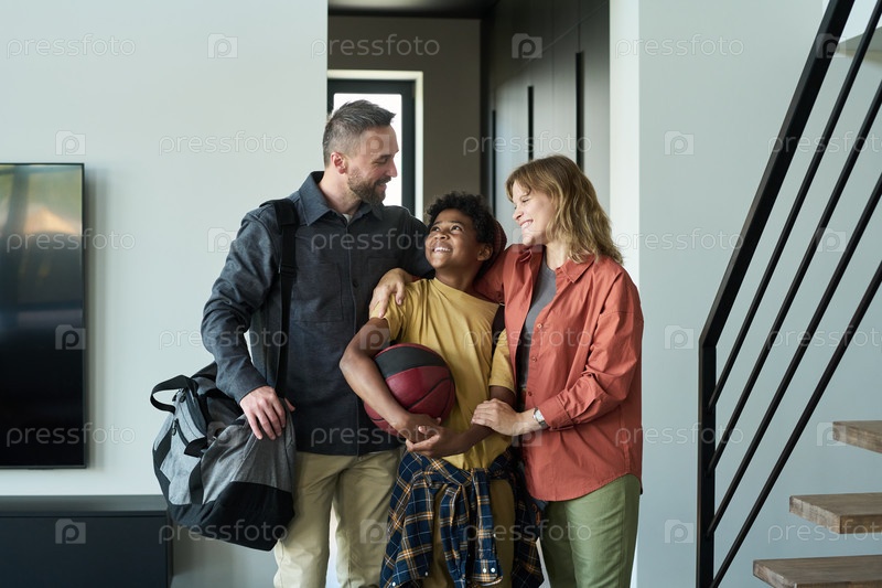 Улыбающаяся семья приветствует баскетболом на пороге дома
