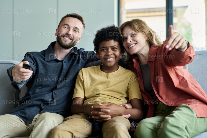 Портрет счастливой семьи, сидящей на диване, улыбающейся и жестом