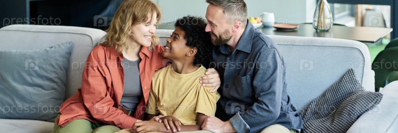 Улыбающаяся семья сидит вместе на уютном диване дома