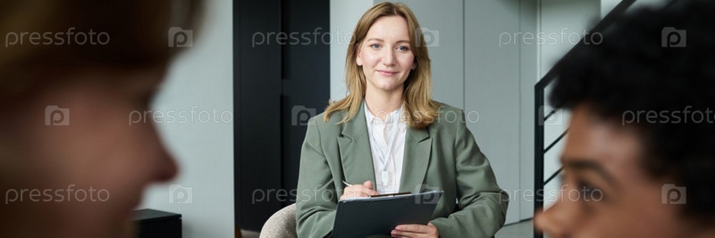 Деловая женщина проводит встречу с коллегами, улыбаясь