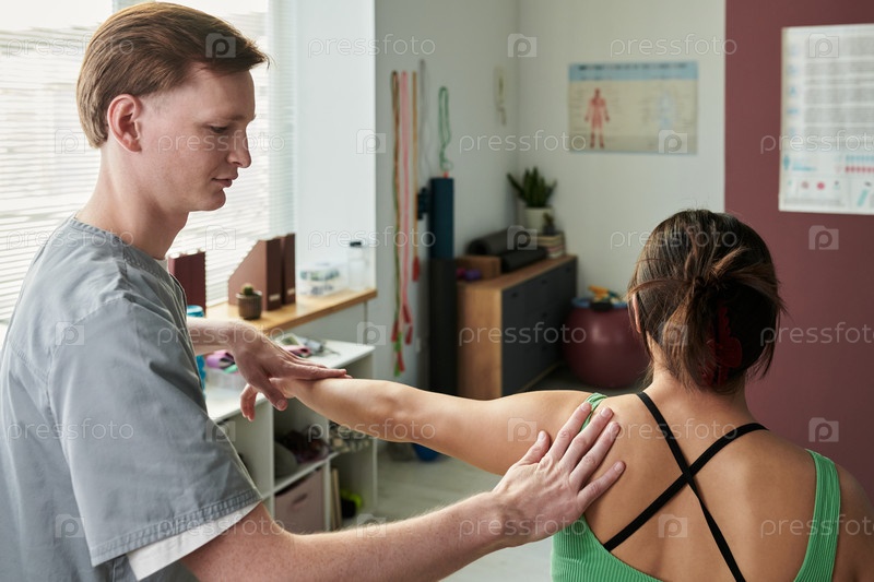 Физиотерапевт работает с пациентом в кабинете клиники