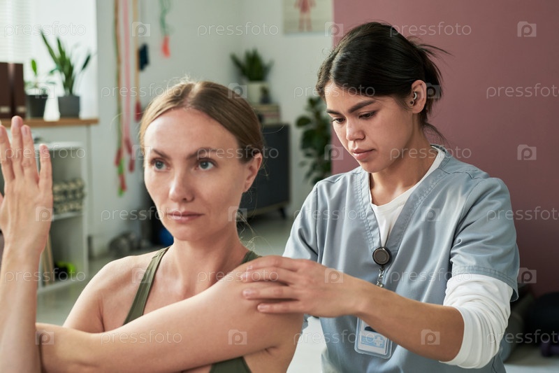 Проведение физиотерапии на женщине-пациенте профессиональным терапевтом