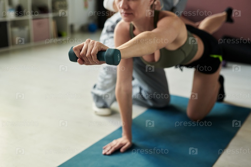 Женщина, выполняющая упражнения с помощью гантелей в фитнес-студии