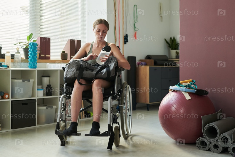 Женщина организует оборудование для тренажерного зала, сидя в инвалидном кресле