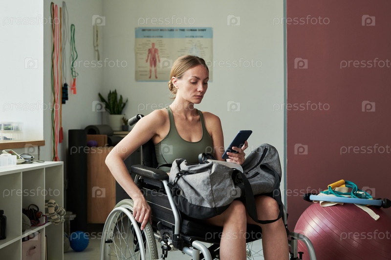 Женщина в инвалидной коляске проверяет телефон в гостиной