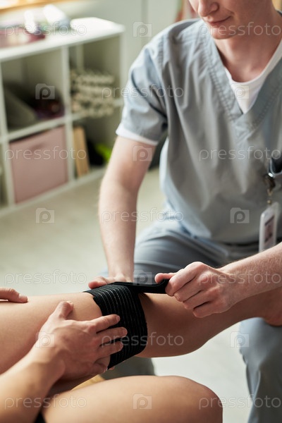 Нанесение вспомогательной повязки на ногу пациента медицинским специалистом