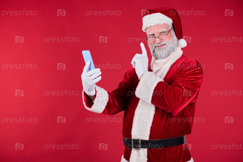 Санта Клаус делает селфи со смартфоном на красном фоне