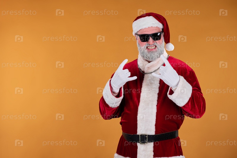 Санта Клаус указывает на камеру, нося солнцезащитные очки