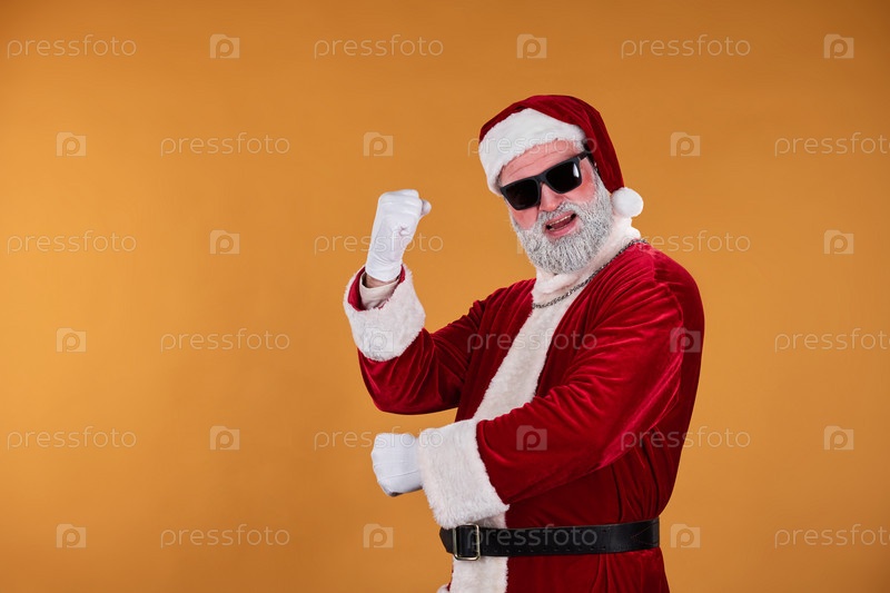 Санта-Клаус позирует в красном костюме с солнцезащитными очками