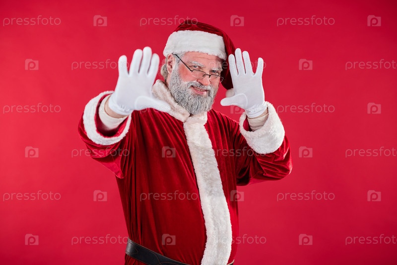 Улыбающийся Санта-Клаус машет рукой на красном фоне