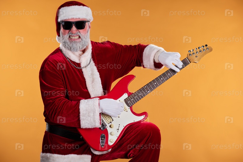 Санта Клаус играет на электрической гитаре с энтузиазмом