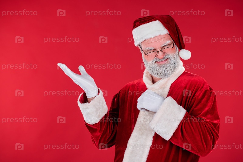 Улыбающийся Санта-Клаус машет рукой на красном фоне