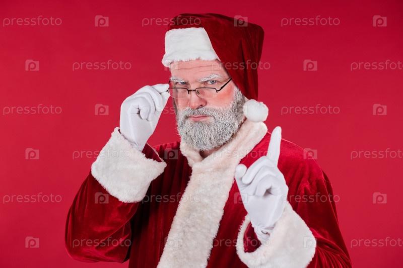Портрет старшего Санта-Клауса, регулирующего очки на красном фоне
