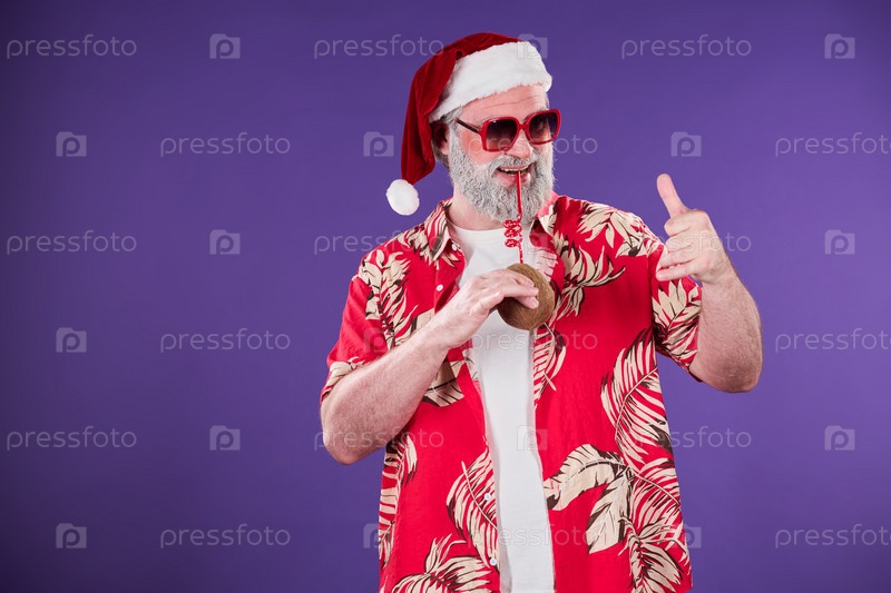Портрет игривого Санты в красной рубашке на фиолетовом фоне