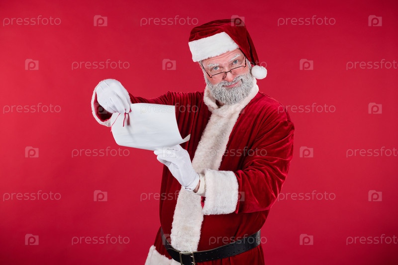 Санта-Клаус читает плохой и хороший список на красном фоне