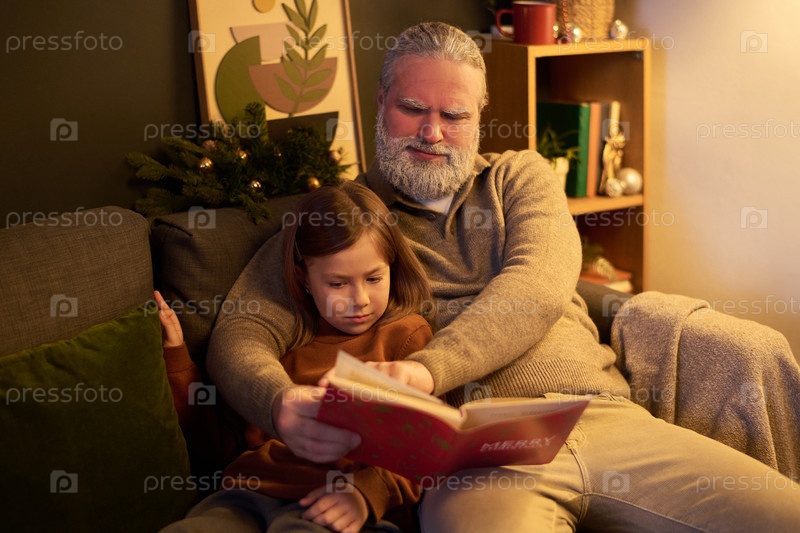 Дедушка читает книгу с маленькой внучкой