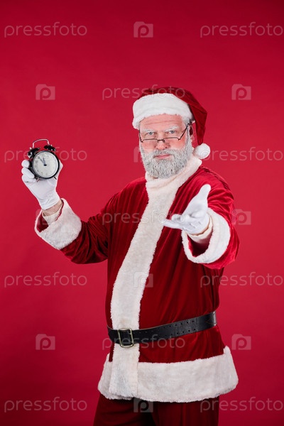 Санта Клаус держит часы на праздничном красном фоне