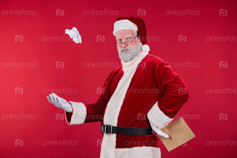 Бросающий бумажный мяч в костюм Санты Клауза против Красной стены