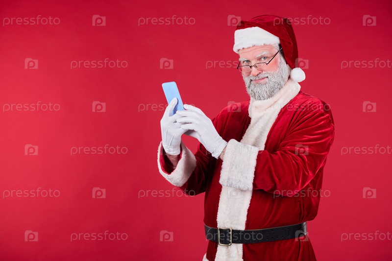 Портрет Санты-Клауса, использующего смартфон на красном фоне