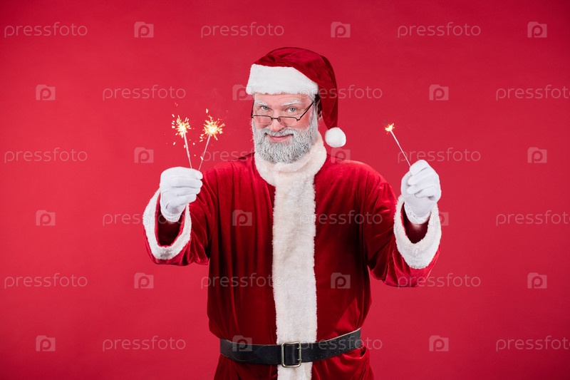 Санта Клаус держит искры в праздничной обстановке